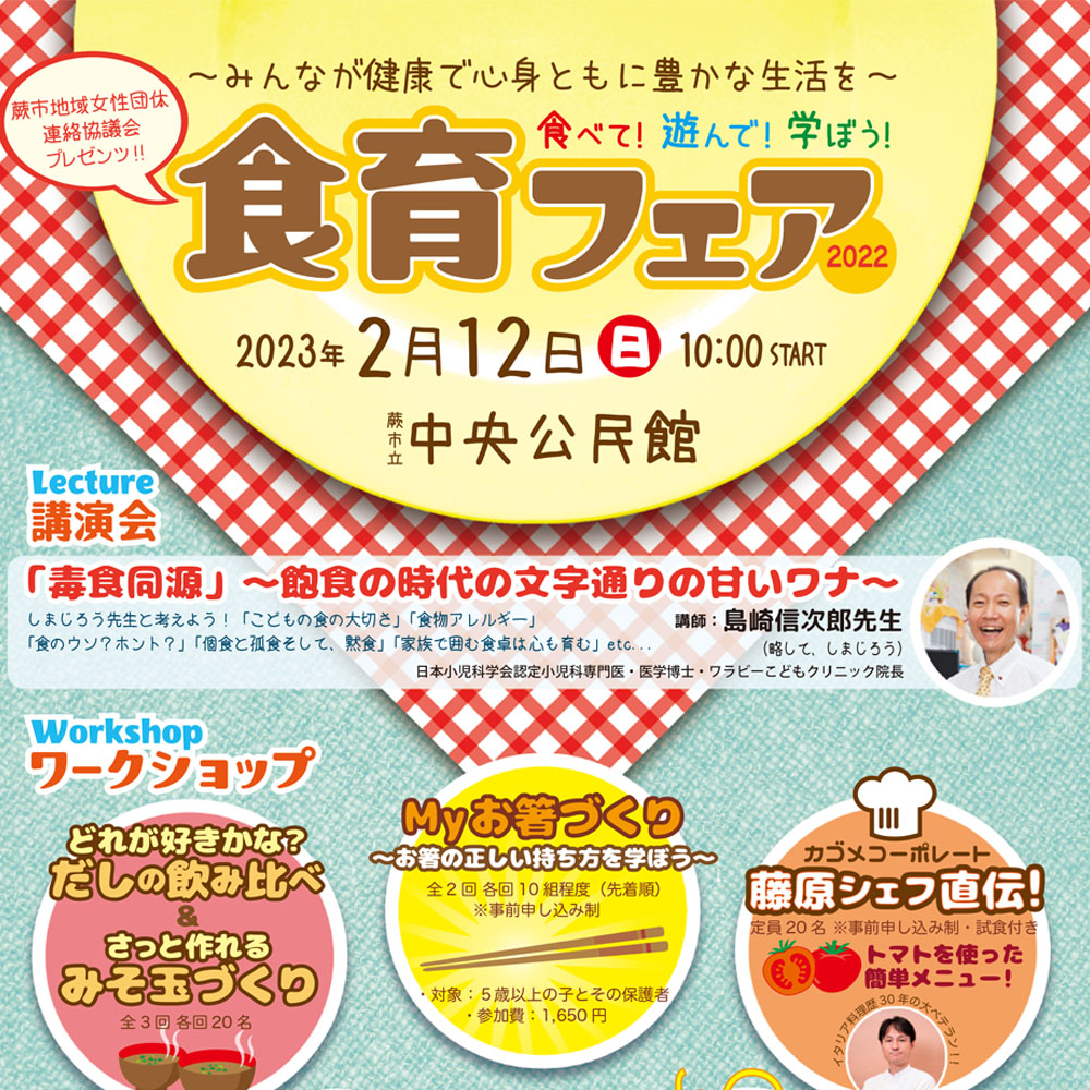【埼玉県イベント】 「食べて!遊んで!学ぼう!食育フェア2022」 日時:2023年2月12日(日)10:00〜 会場:埼玉県蕨市 中央公民館 Myお箸づくりのワークショップ(各回10組) 1回目:10:30〜 (残席あり) 2回目:13:00〜 (満席) 3回目:15:00〜 ... -