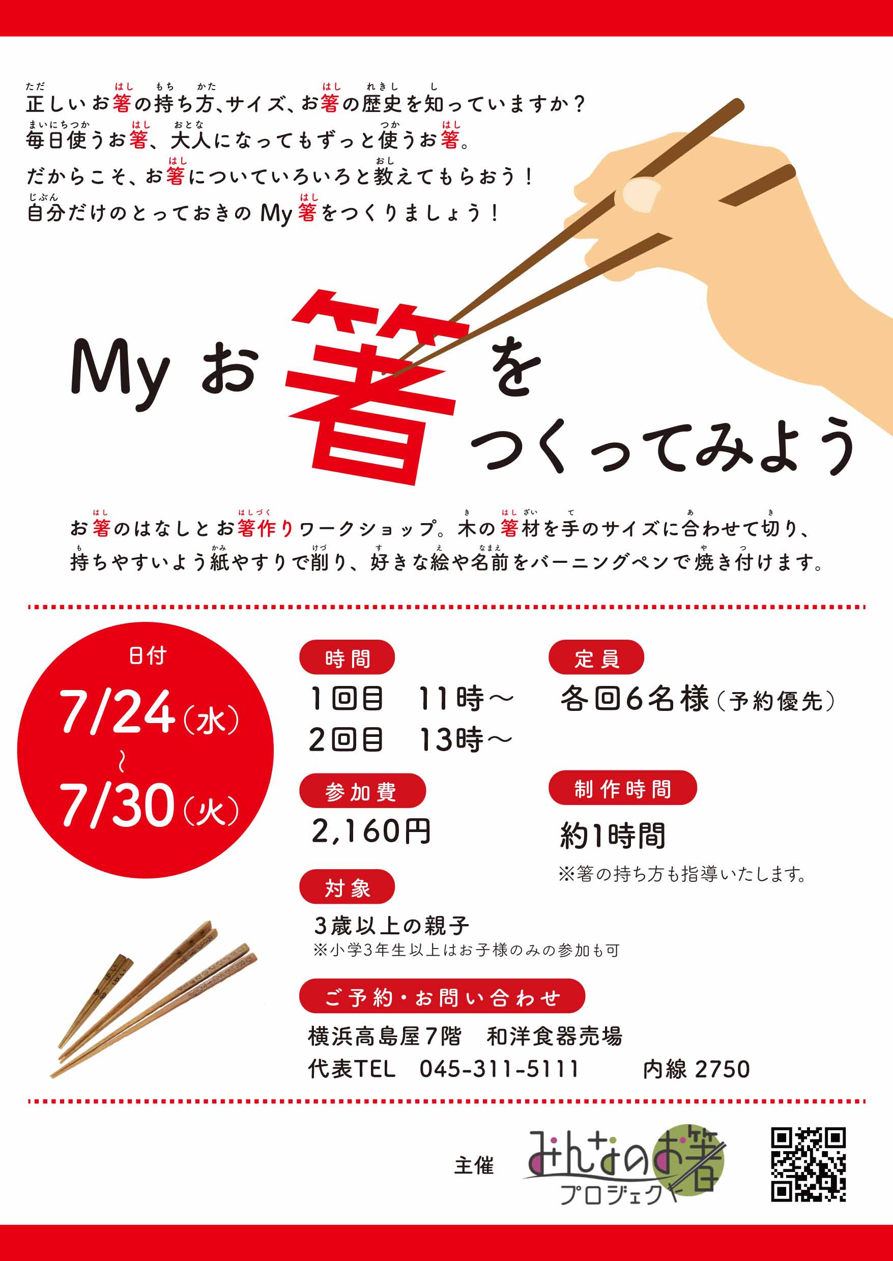 横浜高島屋7F食器売り場にて1週間箸作りのワークショップを開催致しますした。